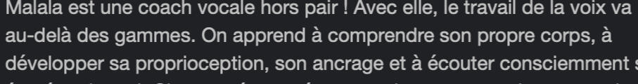 je ne retiens qu'une chose :la VOIX NE SE LIBERE QUE LORSQUE LE COEUR S'OUVRE,autrement, la libération est artificielle.